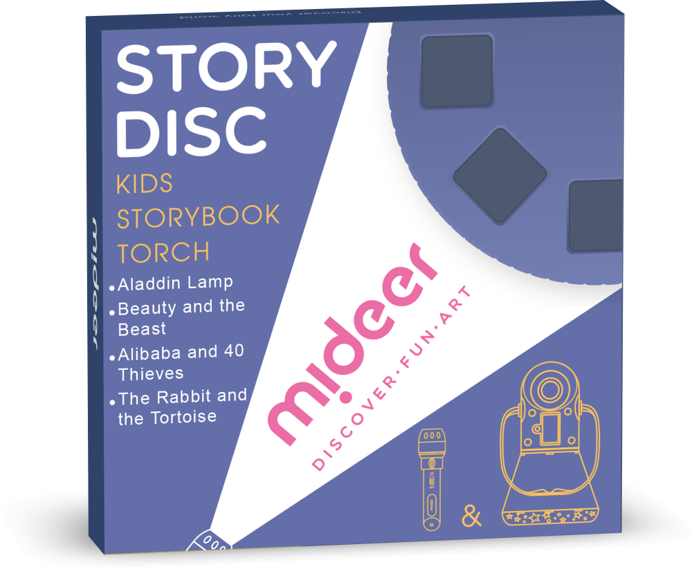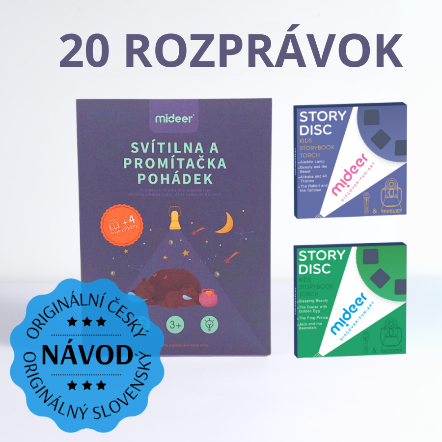 Dětská kreativní promítačka pohádek včetně 20ti pohádek O Třech prasátkách, O Červené karkulce, O Kočce a lišce a O Ošklivém káčátku, O Malence, O Pinocchiovi, O Šťastném princi, O Popelce,O pasáčkovi, který rád žertoval, O perníčku, O velké řepě, Cesta do vesmíru, Aladdinova kouzelná lampa, Kráska a zvíře, Alibaba a čtyřicet loupežníků, bajka Zajíc a želva, Šípková Růženka, Husa a zlaté vejce, Žabí princ a Jack a fazole.