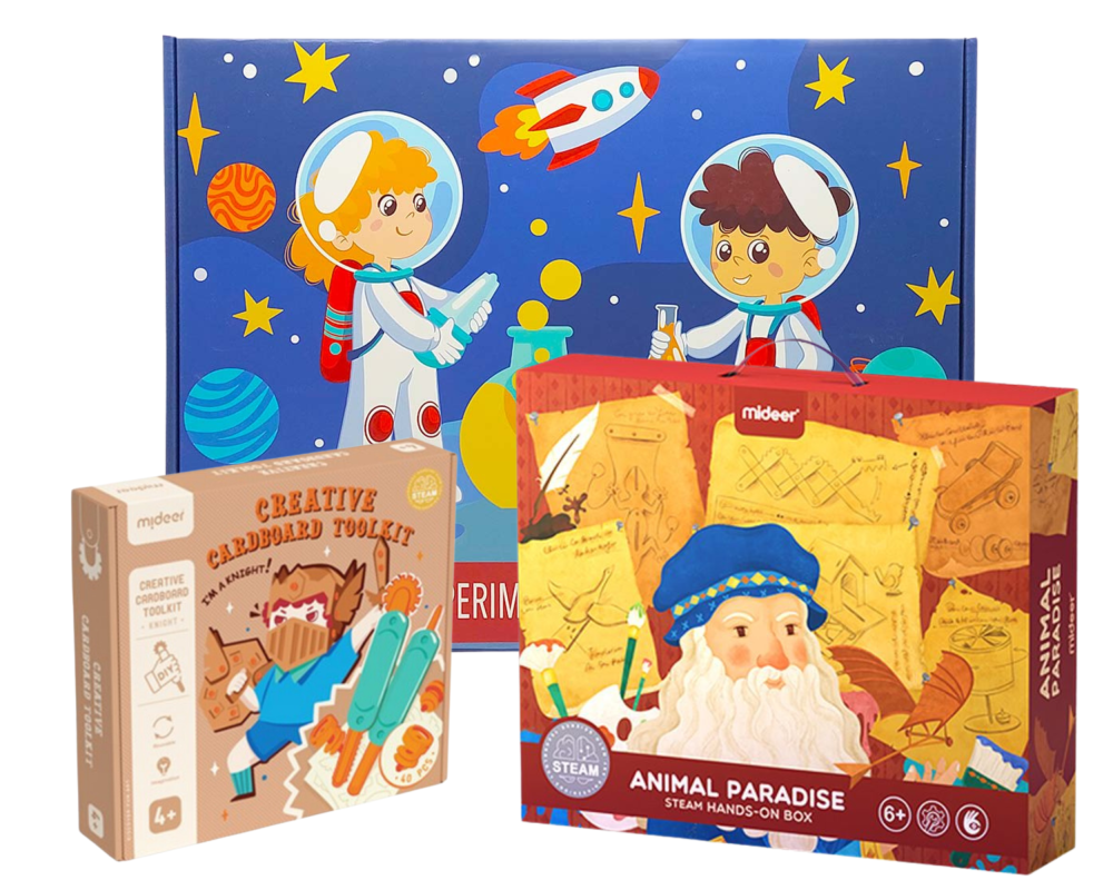 Sada Mideer Malý vynálezca 3v1 kombinuje tri úžasné aktivity – vedecké experimenty, výrobu rytierovho brnenia a kreatívne tvorenie.