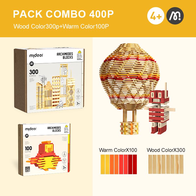 Sada obsahuje 400 dôkladne opracovaných drevených kociek jednotného tvaru, ktoré vám umožnia postaviť neobmedzený počet konštrukcií – od jednoduchých domov a lodí po vysoké veže a celé mestské panorámy.