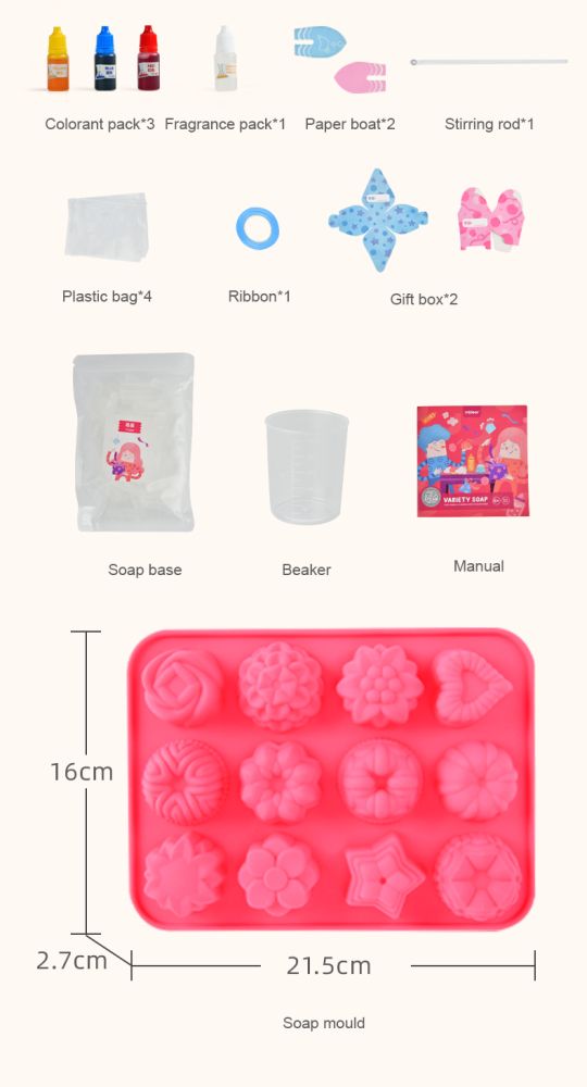 Súčasť balenia: formy, farby, pohárik a drobné príslušenstvo – stačí len rozpustiť základ, pridať farbu podľa vlastnej fantázie a naliať do formy.