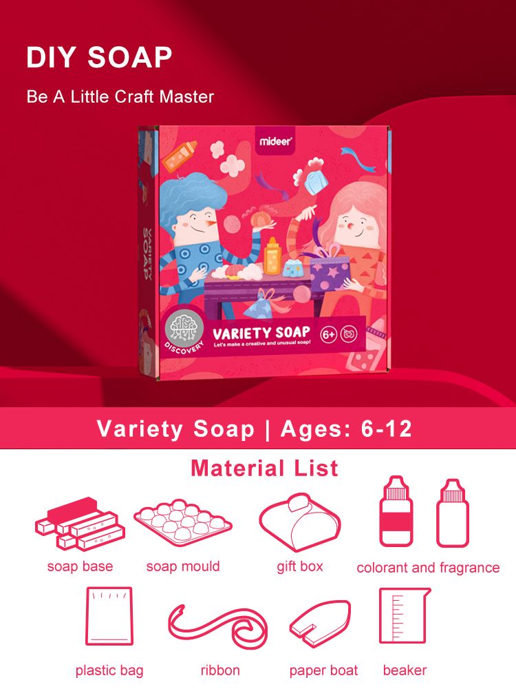 Táto kreatívna sada na výrobu mydla od spoločnosti Mideer je zábavná a vzdelávacia sada, ktorá umožňuje deťom aj dospelým vytvárať vlastné farebné a originálne mydlá.