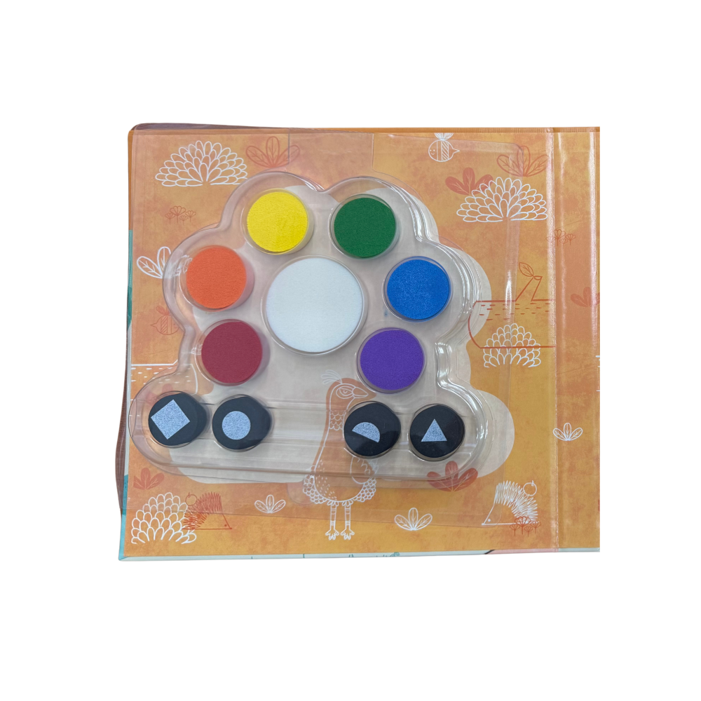 Súčasťou sady je šesť farieb, štyri pečiatky a omaľovánky.